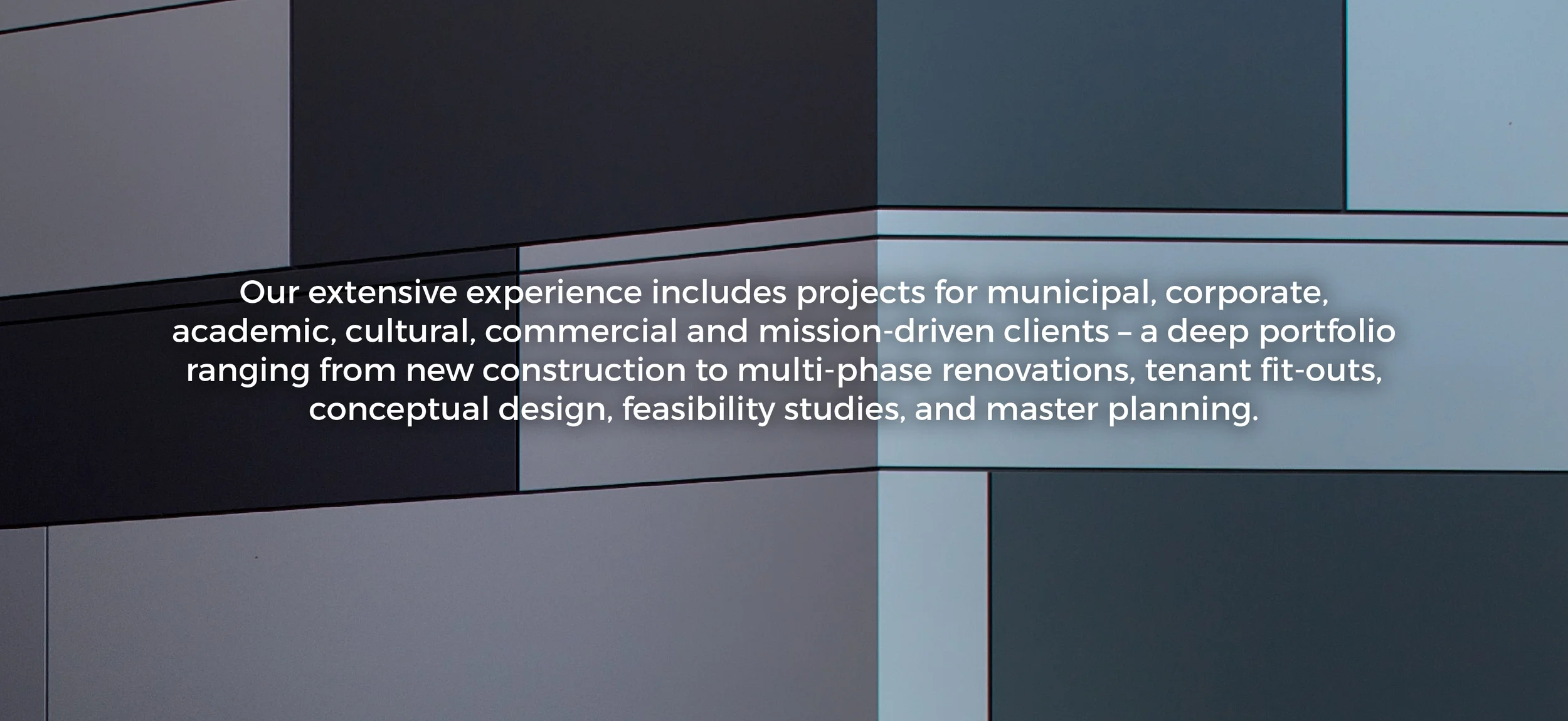 Our extensive experience includes projects for municipal, corporate, academic, cultural, commercial and mission-driven clients – a deep portfolio ranging from new construction to multi-phase renovations, tenant fit-outs, conceptual design, feasibility studies and master planning.